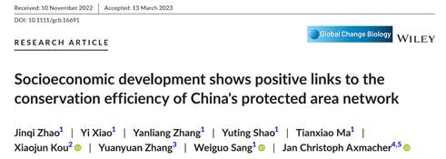 1. 2023年3月30日,关于“社会经济发展对自然保护地保护成效的促进作用”的研究成果以“Socioeconomic development shows positive links to the conservation efficiency of China's protected area network”为题发表在生物多样性保护主流期刊Global Change Biology (中科院1区Top期刊,IF=13.21)上,文章链接://doi.org/10.1111/gcb.16691