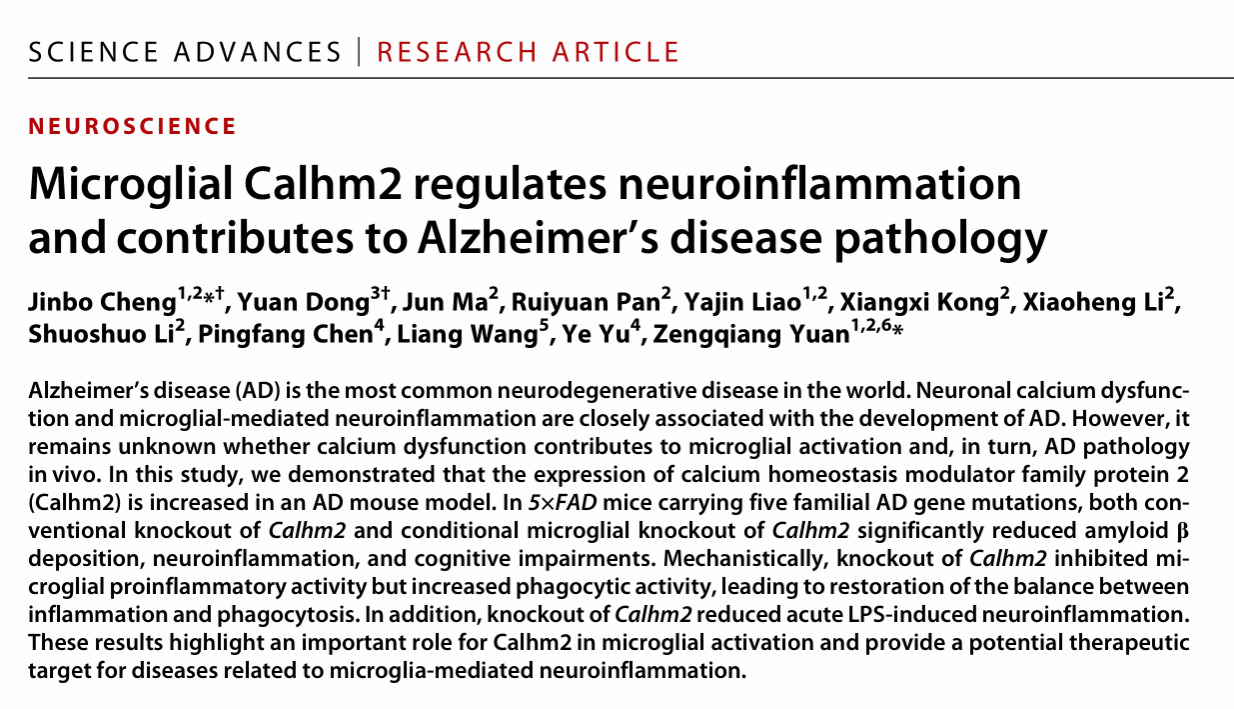 1.2021年8月,程金波教授以第一和通讯作者在国际顶级期刊Science子刊Science Advances(中科院1区Top期刊,IF=14.9)发表了在AD致病机制方面的研究成果。该项研究首次明确了钙稳态调节蛋白Calhm2在小胶质细胞激活中的重要作用,丰富和拓展了AD领域中的钙稳态理论,揭示了神经炎症发生的分子机制,为靶向神经炎症治疗AD提供了重要靶点和潜在的干预策略。