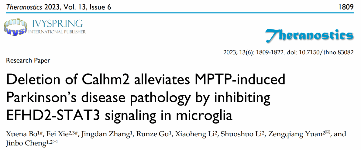 2. 近日,程金波教授团队关于钙稳态调节蛋白Calhm2的进一步研究工作成果以“Deletion of Calhm2 alleviates MPTP-induced Parkinson’s disease pathology by inhibiting EFHD2-STAT3 signaling in microglia”为题发表在国际医学著名期刊Theranostics(中科院1区Top期刊,IF=11.6)上。
