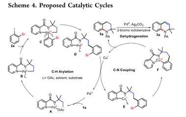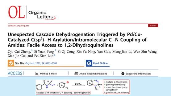 饱和烷烃脱氢制备高价值烯烃是工业生产和合成化学中重要的化学反应,但其苛刻反应条件仍待进一步改进。近年来,利用Pd催化碳氢键活化实现高选择性脱氢反应取得了重要进展,但其底物主要局限于含有酸性活泼氢的羰基类化合物。对于普遍存在的中性惰性碳氢键的烷烃脱氢反应鲜有文献报道。近日,91视频 罗斐贤研究组利用前期发展的碳氢键活化启动的串联反应策略(Org. Lett. 2019, 21, 1668.),探索Pd/Cu协同催化生物质醇小分子衍生制备的酰胺合成高价值四氢喹啉化合物,意外发现了串联中性碳氢键脱氢反应得到具有重要应用价值的1,2−二氢喹啉分子骨架。通过机理研究证实,该反应首先经历Pd催化分子间碳氢键芳基化反应,接下来Cu催化串联分子内碳氮键偶联和后续Pd催化四氢喹啉β,γ−脱氢反应得到1,2−二氢喹啉化合物,实现了三步反应一锅法高效有序转化。此外,脱氢反应步骤中Ag2CO和卤代烃都至关重要。该研究为烷烃脱氢制备高价值烯烃提供了一种全新策略,具有重要的理论价值和潜在应用价值。相关研究成果以Unexpected Cascade Dehydrogenation Triggered by Pd/Cu−Catalyzed C(sp3)−H Arylation/Intramolecular C−N Coupling of Amides: Facile Access to 1,2−Dihydroquinolines为题在《Organic Letters》(化学1区,有机化学TOP期刊,IF=6.072 (Nature Index收录),Org. Lett. 2022, 24, 8283.)上发表。//doi.org/10.1021/acs.orglett.2c03203