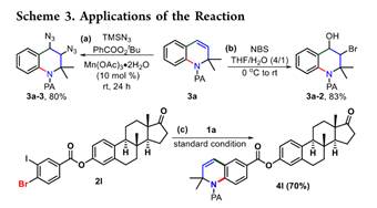 1,2-二氢喹啉化合物是易于衍生转化且有重要应用价值的中间体,广泛应用于医药、材料和合成化学等领域。该研究为合成1,2-二氢喹啉分子骨架提供了一种全新合成策略,底物适用范围广、官能团兼容性好、能够克级规模放大和易于衍生转化实现分子多样性。该方法可以为该类药物分子库快速构建和助力新药研发提供了新的合成方法,具有潜在的应用价值。