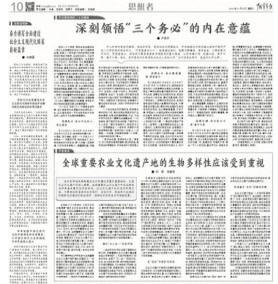 2022年11月8日,《中国青年报》第10版“思想者”栏目刊登了研究生白雨同学和龙春林教授署名的题为“重要农业文化遗产地的生物多样性应受到保护”一文,聚焦农业文化遗产地的生物多样性,提出在实践中要基于“人与自然和谐共生”的思想,兼顾“活态”传承,因地制宜地推进生物多样性的有效保护和生物资源的合理利用,确保农业生态系统的安全和可持续发展。