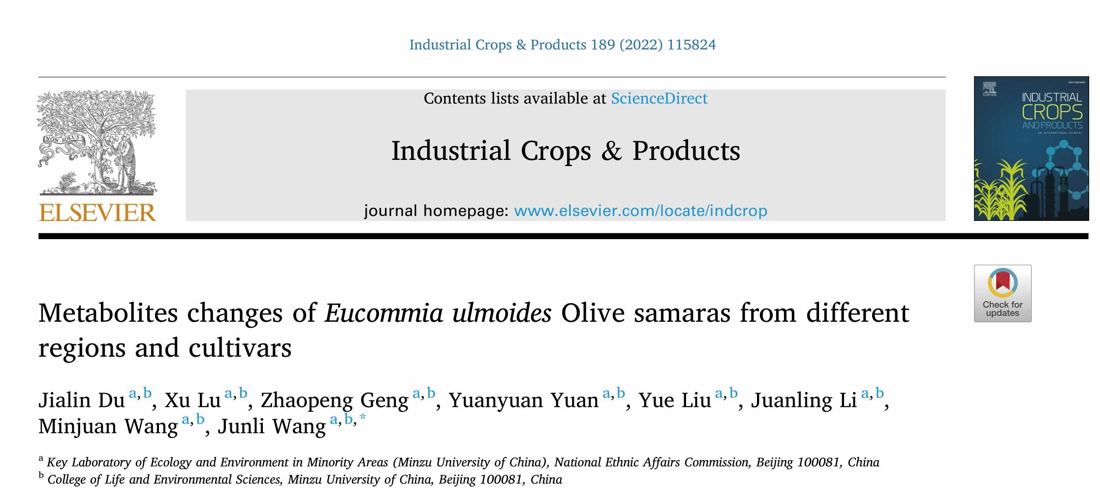 随着人们对杜仲认识的深入,对杜仲的利用由树皮、树叶、雄花逐渐扩展到翅果。产地和品种直接影响次生代谢物的种类、含量,这与药用植物内在的品质密切相关。但目前对不同产地和品种间杜仲翅果内源性代谢物差异的研究很少。王俊丽教授团队采用代谢组学方法,研究了不同产地和不同栽培品种对杜仲翅果内源代谢产物变化的影响。相关研究成果近期以“Metabolites changes ofEucommia ulmoidesOlive samaras from different regions and cultivars”为题发表在Industrial Crops and Products(农林科学类1区Top期刊,IF = 6.449)上。原文连接://doi.org/10.1016/j.indcrop.2022.115824