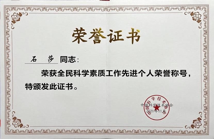 石莎作为学校科普工作的代表,始终以专业知识为依托,将科学普及理念与生态文明教育相结合,通过科普讲解大赛、科普题材视频、科普讲座、科普海报展,参与公益活动项目,走进小学、幼儿园等多种形式,从课堂走向社会,积极投身于科学普及与传播工作,为提高全民科学素质努力,成为科普工作的践行者和推广者。