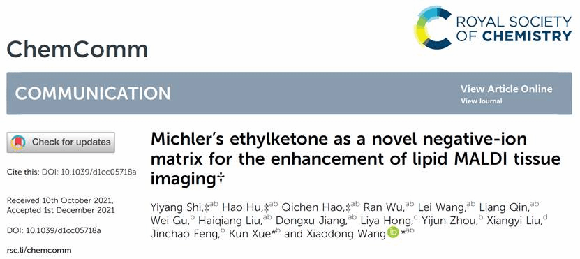 (质谱成像与代谢组学国家民委重点实验室)王晓东教授团队继成功筛选出适用于动、植物组织样本表面多种内源性小分子化合物原位表征新型基质(DMCA)(Analytical Chemistry, 2019, 91(4), 2634-2643,SCI一区)、DCH(Chemical Communications, 2019, 55(83), 12559-12562,SCI一区)后,在MALDI源质谱脂质成像新型基质研究领域又取得了重要进展,相关研究成果以“Michler's ethylketoneas a novel negative-ion matrix for the enhancement of lipid MALDI tissue imaging”为题,发表在分析化学综合顶级期刊《Chemical Communications》(Nature Index收录)上,该研究论文同时被遴选为期刊封面文章(Front Cover)。该研究成果是王晓东教授团队2021年度在分析化学顶级期刊《Analytical Chemistry》(2021, 93(35), 11920-11928, Front Cover)、《Chemical Communications》(2021, 57(82), 10707-10710, Back Cover)连续发表封面文章后再次入选顶级期刊封面文章(Front Cover),91视频