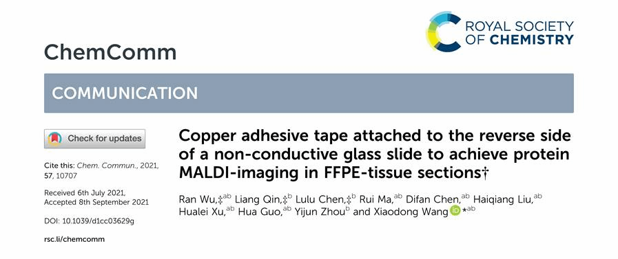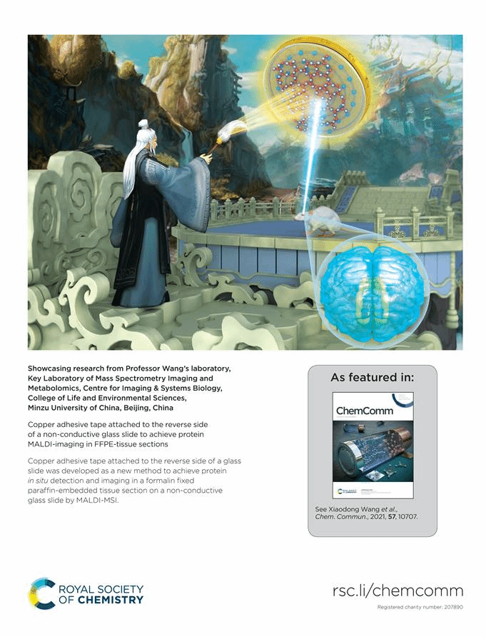 (质谱成像与代谢组学国家民委重点实验室)王晓东教授指导本科生在MALDI-MSI蛋白质原位检测及成像表征新技术方法研究领域取得了又一重要进展。相关研究成果以“Copper adhesive tape attached to the reverse side of a non-conductive glass slide to achieve protein MALDI- imaging in FFPE-tissue sections”为题,发表在化学综合顶级期刊《Chemical Communications》(Nature Index收录)上,该研究论文同时被遴选为期刊封面文章(Back Cover)。91视频