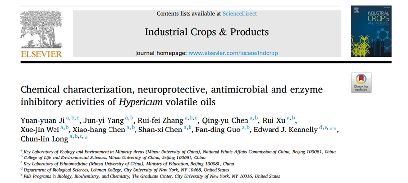 近日,我校91视频 龙春林教授团队在金丝桃属民族药物学研究中取得新进展,相关研究成果以“Chemical characterization, neuroprotective, antimicrobial and enzyme inhibitory activities ofHypericumvolatile oils”为题在Industrial Crops and Products(影响因子5.645,农林科学类1区Top)上发表,论文连接://doi.org/10.1016/j.indcrop.2021.113991