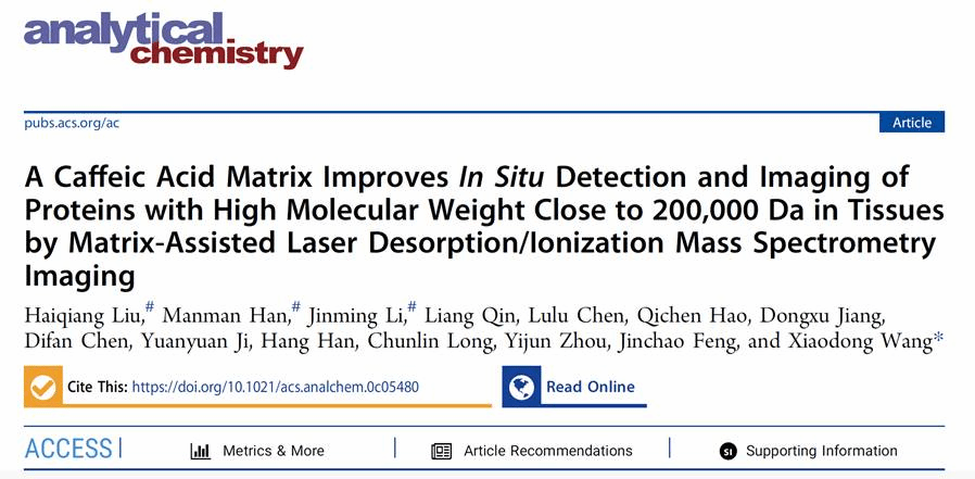 (质谱成像与代谢组学国家民委重点实验室)王晓东教授团队在MALDI-MSI蛋白质原位检测及成像表征新型基质研究领域取得了又一重要进展。相关研究成果以“A Caffeic Acid Matrix Improves In Situ Detection and Imaging of Proteins with High Molecular Weight Close to 200,000 Da in Tissues by Matrix-Assisted Laser Desorption/Ionization Mass Spectrometry Imaging”为题,发表在分析化学顶级期刊《Analytical Chemistry》(Nature Index收录)上,该研究论文同时被遴选为期刊封面文章。91视频