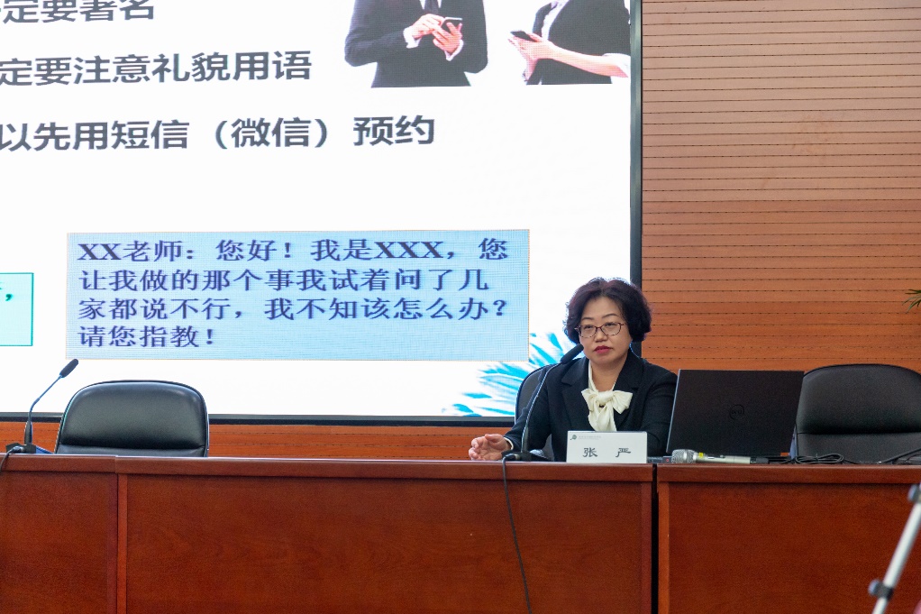 讲座伊始,张严老师以不同国家、不同民族、不同地域和不同文化的礼仪差异性和统一性为引入点,从礼仪的特点、基本要求、重要性以及基本要素四个部分为大家展开讲解。她强调了礼仪礼貌在人际交往中的关键作用,教导同学们要注重生活中的“形、言、行”,并对同学们日常生活中可能出现的具体礼貌礼仪问题进行了剖析。