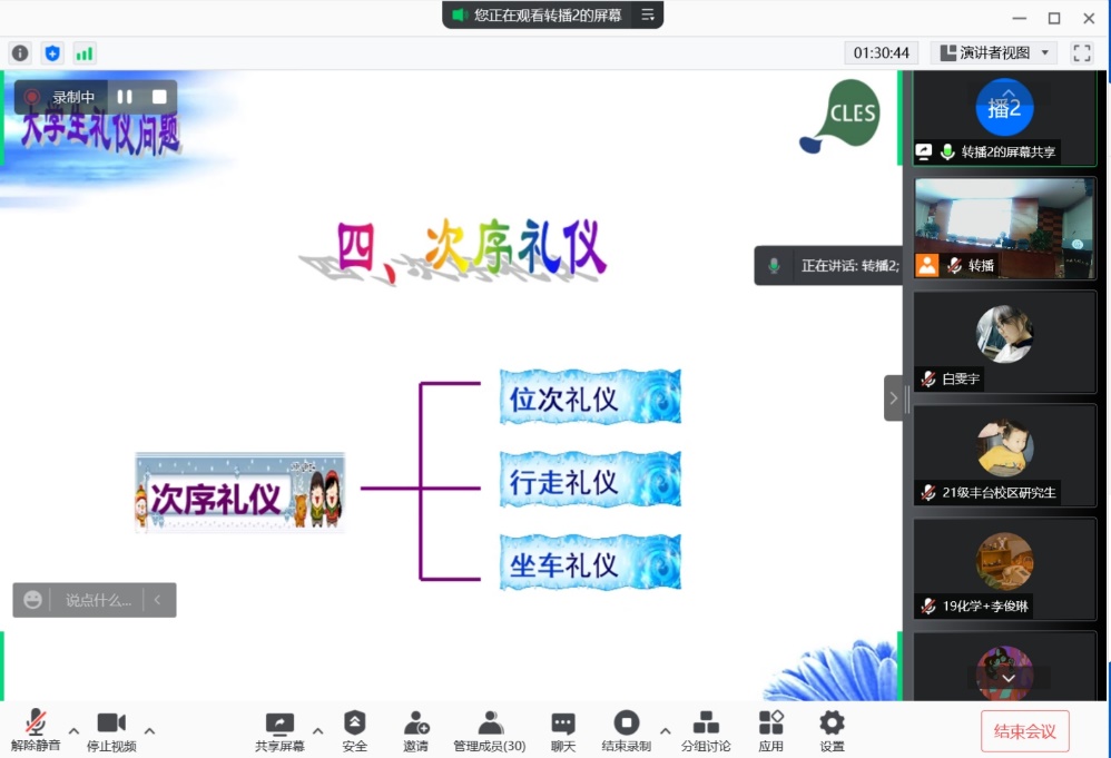 同时本次讲座也为2021级硕士、博士及本科生各班心理委员转播。同学们认真观看直播,认识到了礼仪礼貌在社会交往中的关键性及重要性,并且对日常生活中存在的沟通交流等问题有了更深刻的感悟。