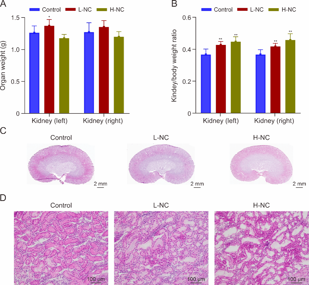 (A)肾脏重量。(B)肾/体重比。(C)重复给药21天后大鼠肾脏切片H&E染色图。(D)肾脏皮质部位H&E染色图。Control:空白对照组,L-NC:低剂量NC(2 mg/kg)给药组,H-NC:高剂量NC(6 mg/kg)给药组。与空白对照组相比,*P < 0.05,**P < 0.01(mean ±(SD),n = 6)。