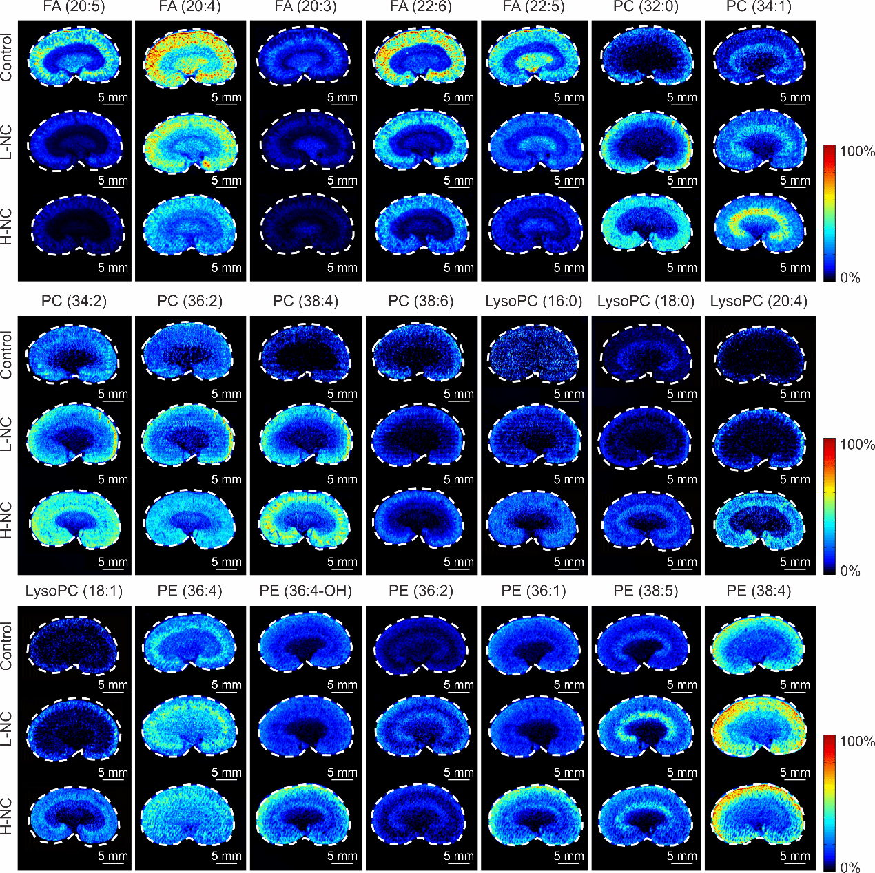 图4 肾脏组织中参与脂质代谢途径的差异代谢物空间分布图像。
