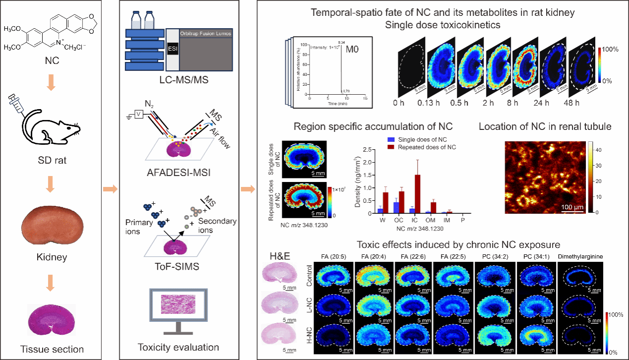 本研究采用本课题组自主研发的高灵敏空气动力辅助解吸电喷雾电离(AFADESI)-MSI及单细胞分辨的飞行时间二次离子质谱(ToF-SIMS)等技术,同时结合空间代谢组学方法,从组织器官、微区及单细胞等不同原位水平开展NC时空代谢及肾毒性研究,旨在揭示NC在肾脏中的代谢和累积特征及其肾毒性的潜在机制(图1)。