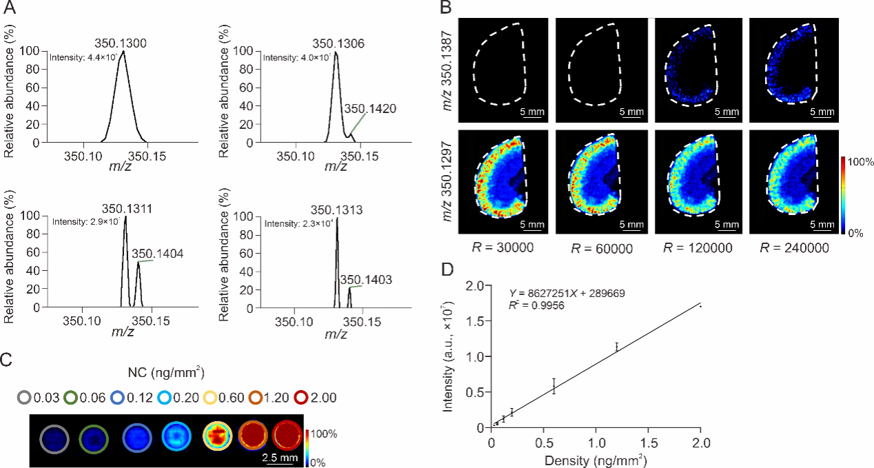 (A)不同质量分辨率下大鼠肾脏中m/z 350.1387和m/z 350.1297离子的质谱图。(B)m/z 350.1387和m/z 350.1297的AFADESI-MSI图。(C)在空白肾组织匀浆切片上NC标准品的AFADESI-MSI图。(D)NC线性标准曲线(R2 = 0.9956, n = 3)。