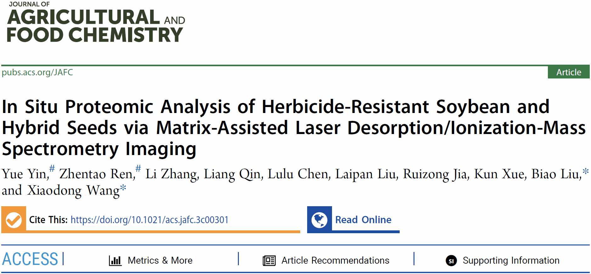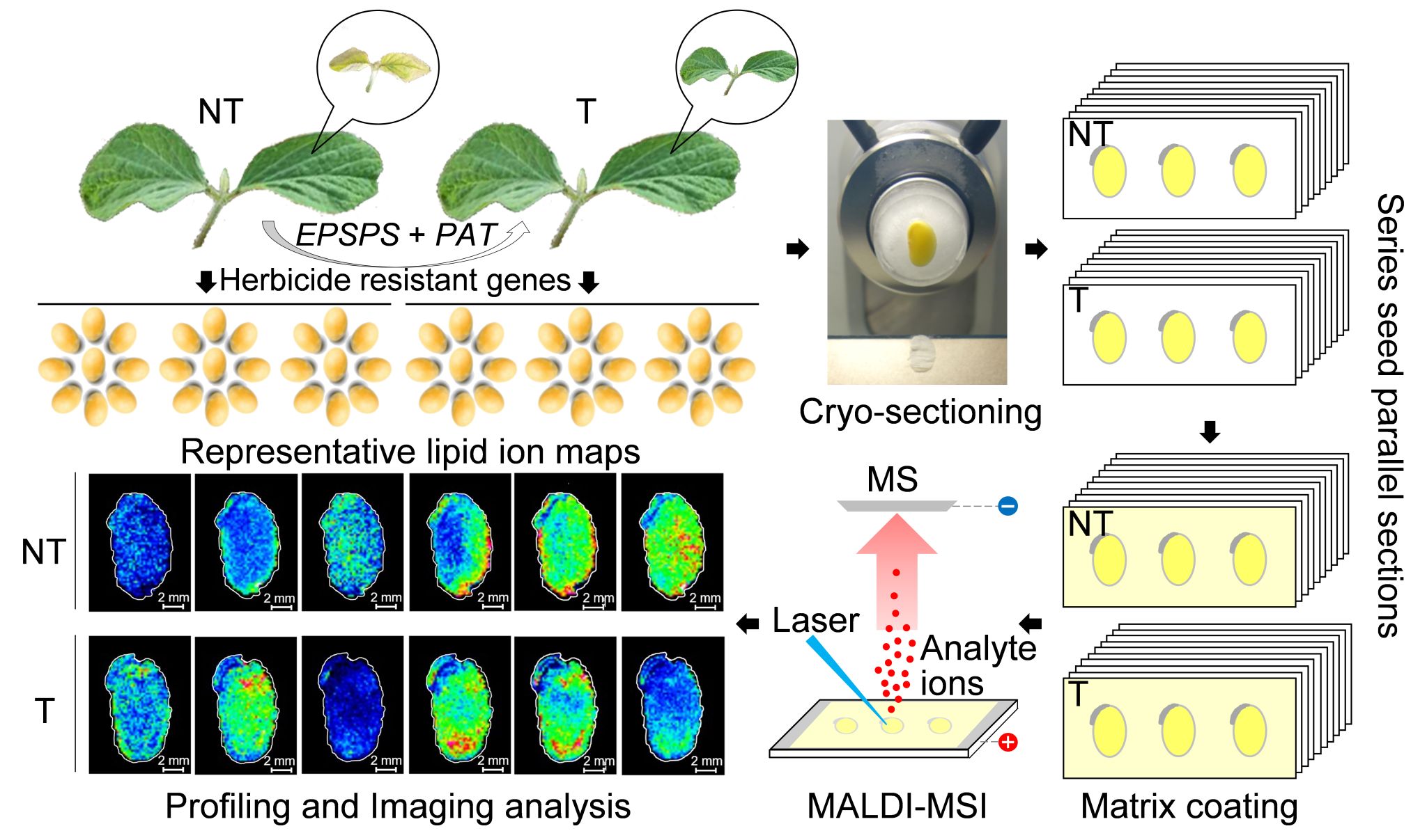 /质谱成像与代谢组学国家民委重点实验室的王晓东教授和薛堃副教授团队,在MALDI源质谱成像新应用领域方面——以MALDI-MSI技术评估转基因大豆脂质组和蛋白质组的非预期效应连续取得两项重要进展,相关研究成果以“Spatial lipidomics of EPSPS and PAT transgenic and non-transgenic soybean seeds using matrix-assisted laser desorption/ionization mass spectrometry imaging” “In situ proteomic analysis of herbicide-resistant soybean and hybrid seeds via matrix-assisted laser desorption/ionization-mass spectrometry imaging”为题,连续发表在农林科学综合权威期刊Journal of Agricultural and Food Chemistry(中国科学院一区,IF=6.1)上,其中脂质组学研究论文被遴选为期刊封面文章(Front Cover),这也是王晓东教授团队近三年来连续发表的第五篇封面论文。