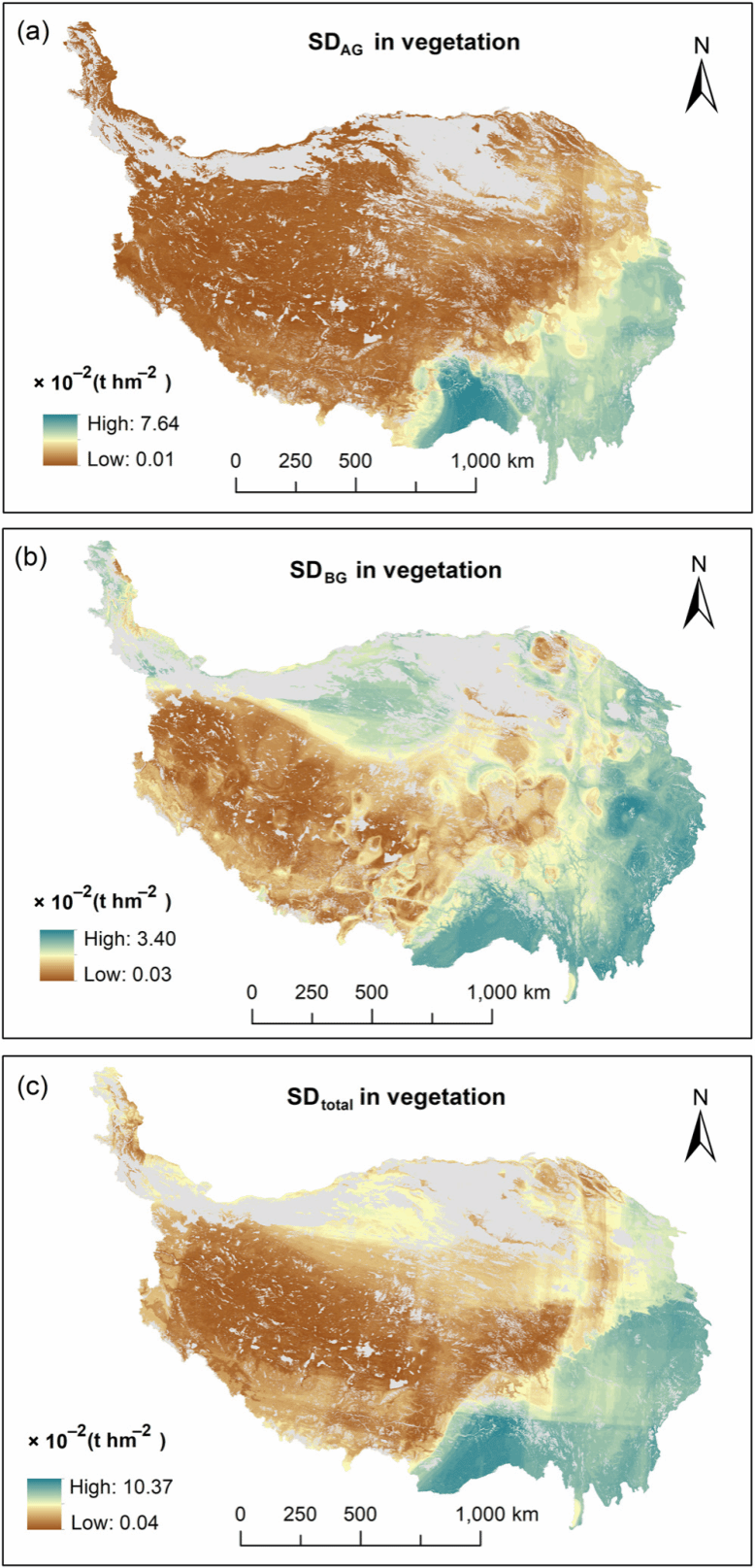 本研究基于680个采样点,2040个植物群落的野外实测数据,系统评估了青藏高原植被硫密度和硫储量的分布格局(图5)。