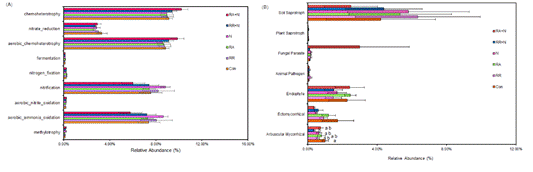 土壤水分是影响生态系统功能的重要因素,改变着微生物群落。2019年,该团队在呼伦湖南岸的草原生态系统中建立了一个覆盖自然土壤水分梯度的研究区域,并将其细分为高含水量(HW)、中含水量(MW)和低含水量(LW)。研究发现,植被特征和土壤理化性质对原核生物丰富度多样性有显著影响,其中土壤含水量是最重要的影响因素(图7)。表型预测显示,原核微生物群落对过高或过低的土壤水分都具有更强的耐受性(图8)。构建的系统发育树表明真菌群落中子囊菌门和担子菌门是最重要的分支。在高水分梯度带中,真菌优势物种与土壤含水量和土壤养分显著相关。此时,土壤粘土形成了一个保护屏障保证了优势纲(子囊菌纲和座囊菌纲)的生存。表明在中国内蒙古呼伦湖生态系统南岸,真菌群落对土壤含水量的响应显著,高含水量组中的真菌群落组成稳定且更易存活。