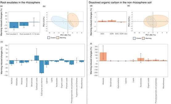 图1 增温对植物根系分泌物及土壤可溶性有机碳的影响